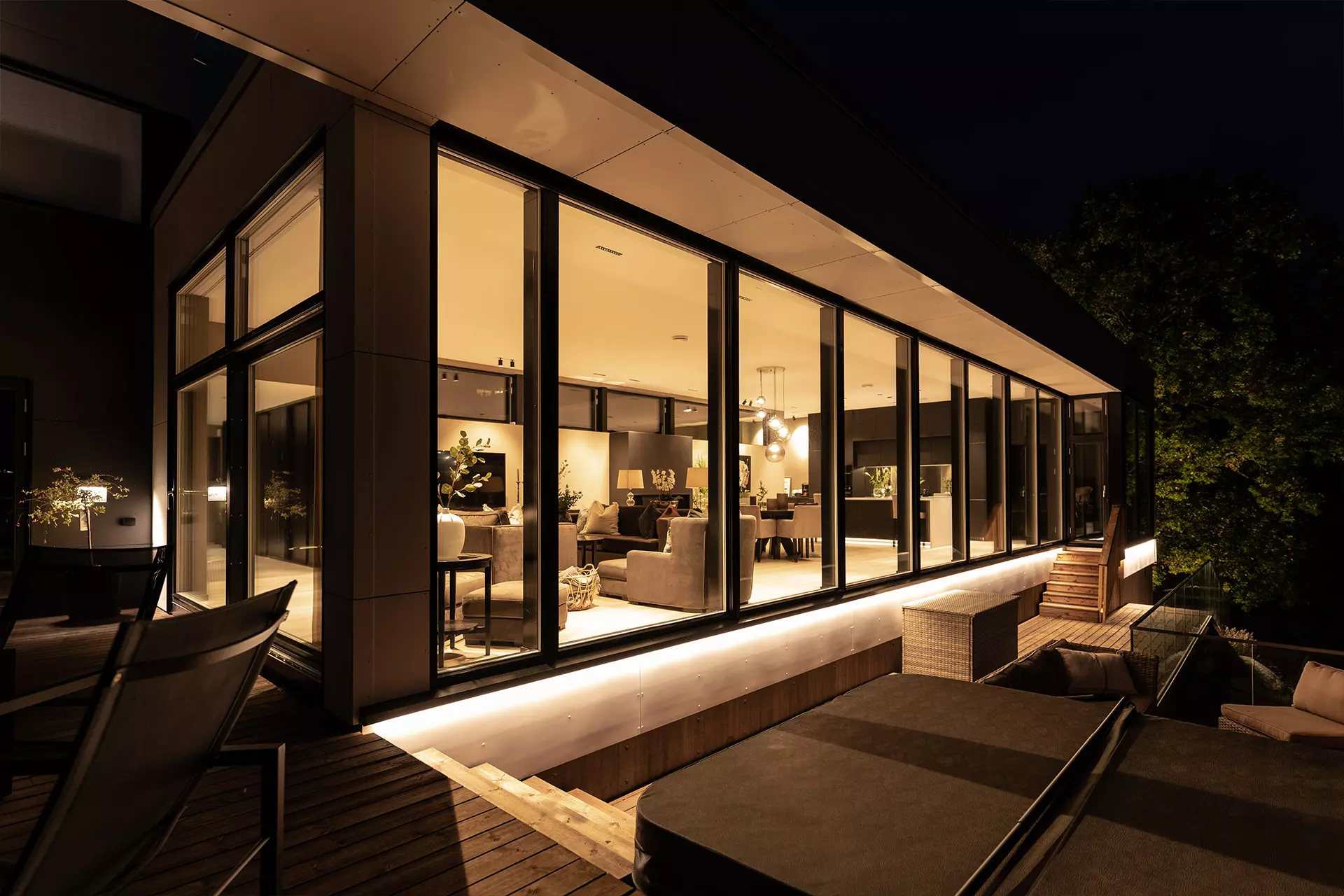 Det ble også lagt vekt på eiendommens unike utendørsområder, som ligger på en naturskjønn tomt i Nøtterøy-skjærgården. For å forsterke atmosfæren ble det montert indirekte belysning plassert over grunnmuren og spesialisert vegetasjonsbelysning rettet mot omkringliggende eiketrær. Dette fremhevet ikke bare de naturlige egenskapene ved eiendommen, men skapte også et dynamisk spill mellom lys og skygge som forbedrer den visuelle opplevelsen av utendørsområdet under forskjellige tider på døgnet.