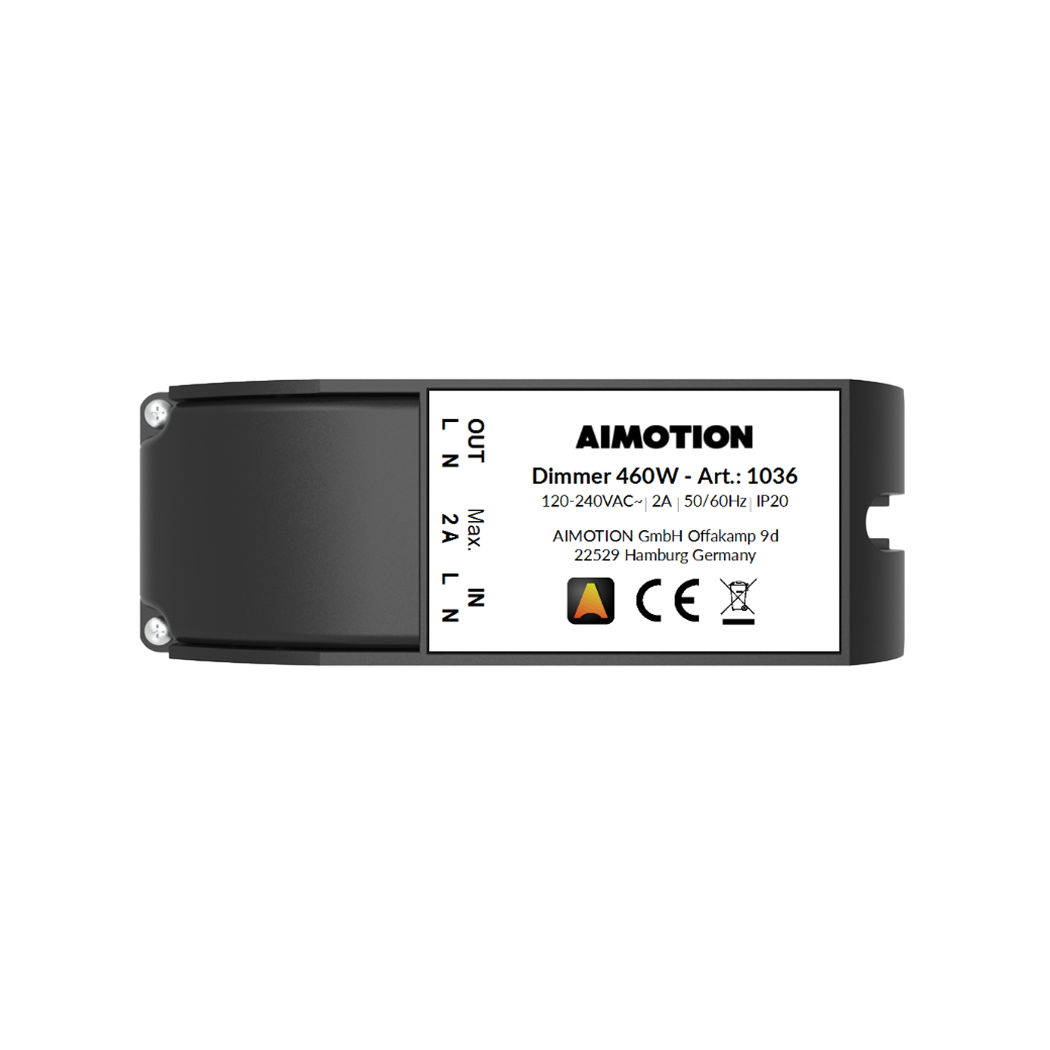 AIMOTION-dimmeren er en høykvalitets bakkant/fasedimmer for dimbare motstandsdyktige og kapasitive høyspenningsbelastninger. LED-dimmeren må ikke brukes til lysrør, vifter eller ringkjernetransformatorer. Den styrer individuelle enheter i Bluetooth Low Energy Mesh nettverket uten bruk av porter, rutere eller ekstra kabling. Dimmeren kan brukes med belastninger på opptil 460W. Konfigurasjonen er trådløs via Casambi appen. Installasjonen kan kun utføres av en sertifisert elektriker.