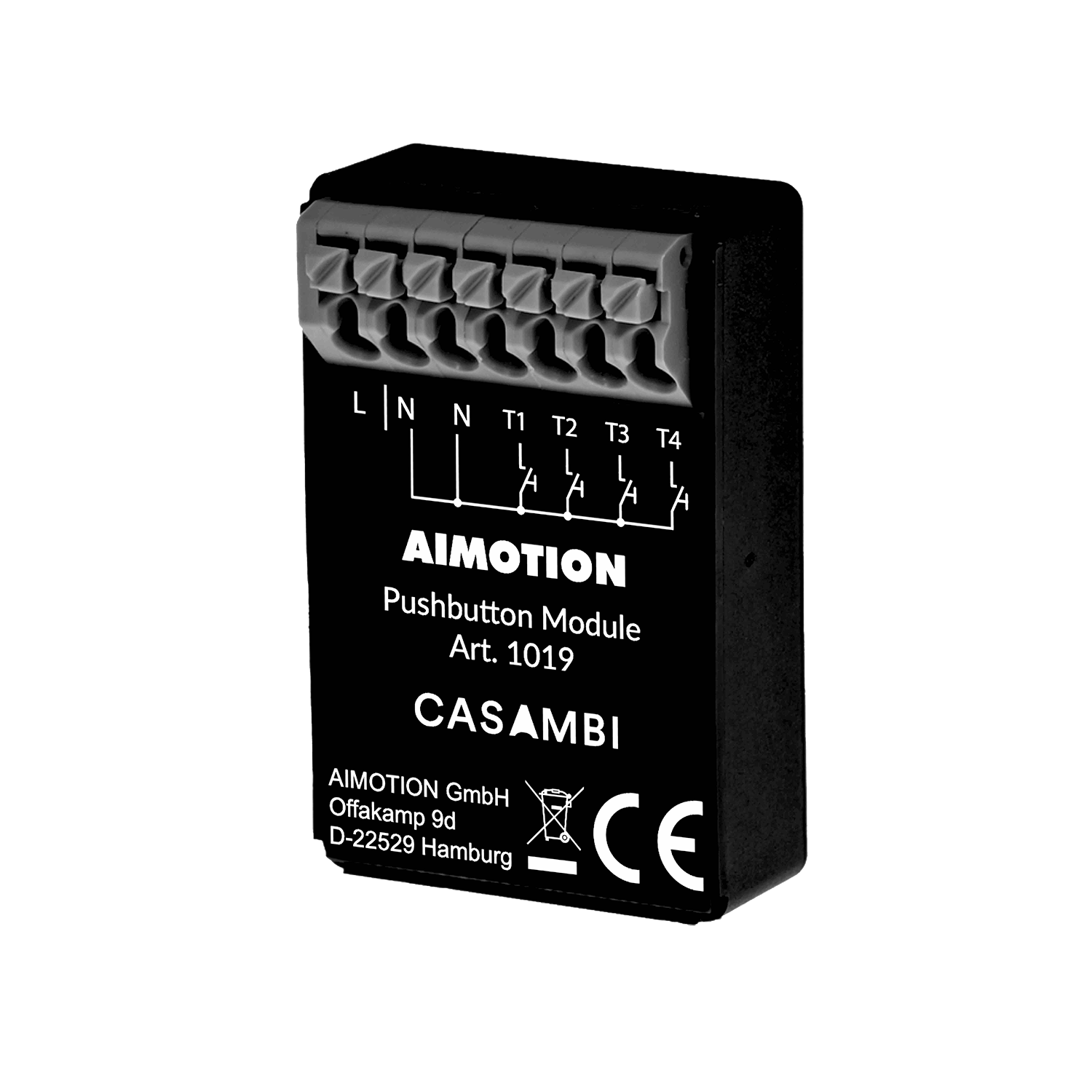 AIMOTION Pushbutton Module 4 CH kommuniserer trådløst i Bluetooth Low Energy Mesh nettverket uten bruk av porter, rutere eller ekstra kabling. Trykknappmodulen er utformet slik at opptil fire standardinnstillinger på trykknappene med nettspenning kan legges til et Casambi-nettverk. Alternativt bevegelsesdetektorer/sensorer eller andre brytere kan kobles til via nettspenning. Forbindelsene styrer f.eks. en armatur, enhet, gruppe, scene/animasjon, alle armaturer el bevegelse/automatisering. Konfigurasjon gjøres trådløst via Casambi-appen. Trykknappmodulen har et kompakt format, egnet