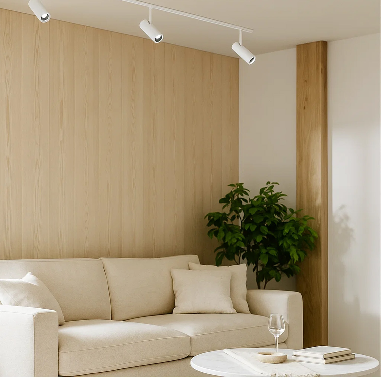 Systemeffekten per spot er 15W, LED-strømmen er 350 mA, og settet drives på 230V 50Hz. Dimming skjer via faseavsnitt. Skinnesystemet fungerer som både monteringsbase og strømmating, noe som gir en praktisk og skalerbar løsning uten behov for omkobling ved senere justeringer.