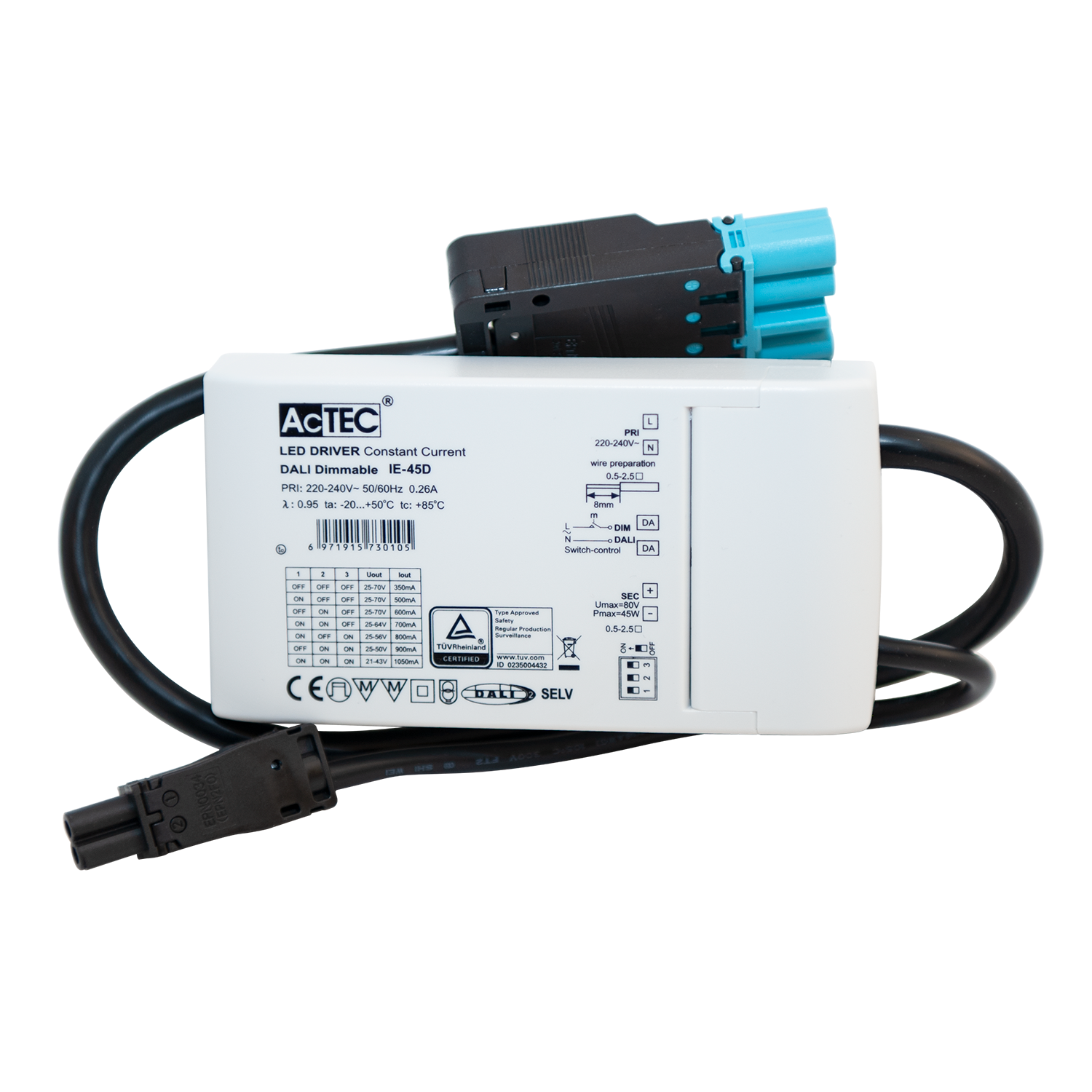 Driver DALI2 900mA Panel er en allsidig og pålitelig driver designet for panelbelysning på opptil 45W. Justerbar fra 350mA til 900mA, ideell for en rekke belysningsapplikasjoner. Med DALI2 og push-dim funksjonalitet gir den presis lyssstyring. Primærside 18i5 male kobling. Sekundærside EPN0034 kobling.