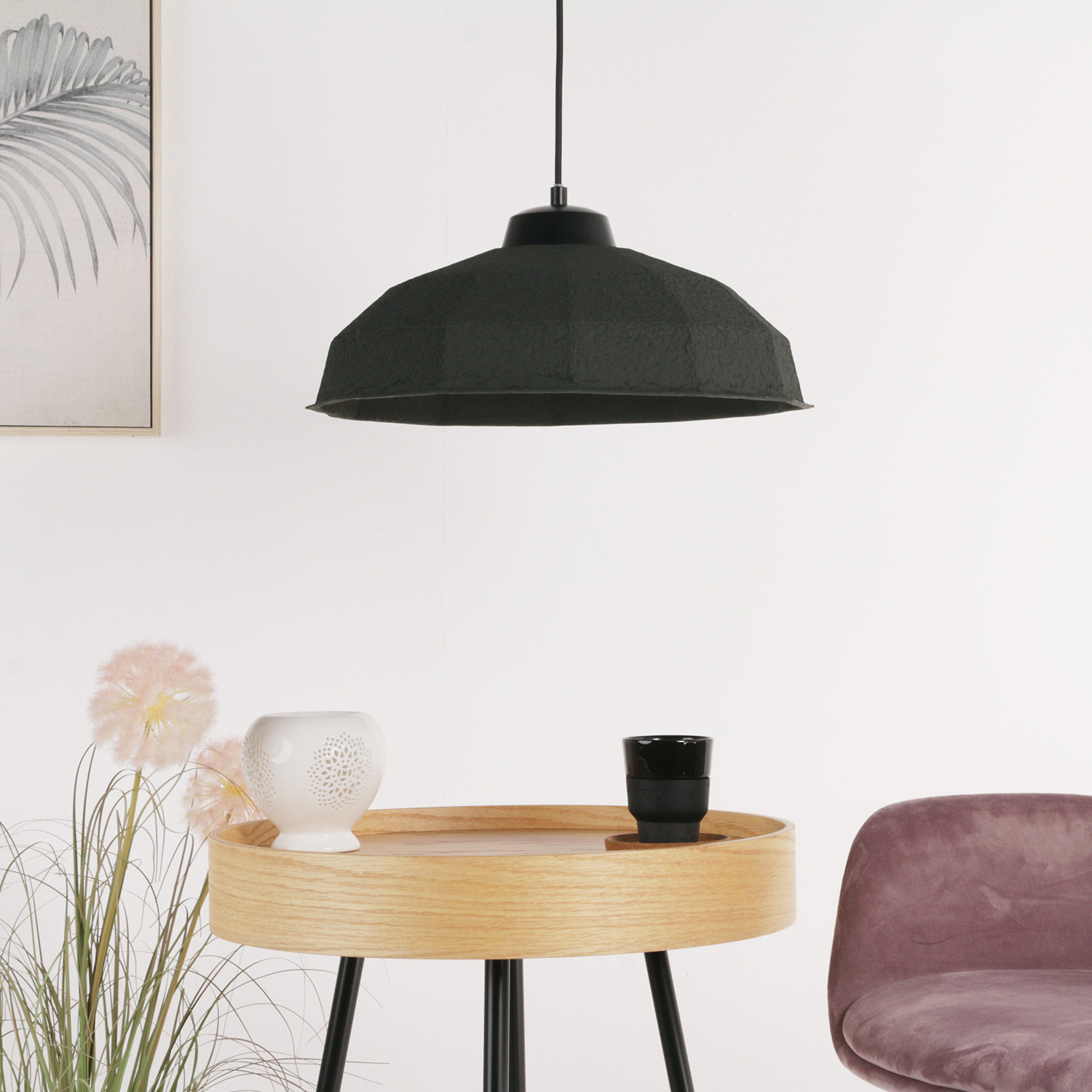 Nedhengt pendel designet med miljøvennlige materialer. Leveres i sort eller natural farge med 3m sort tekstilkabel og takboks. E27 Lyskilde kjøpes separat
