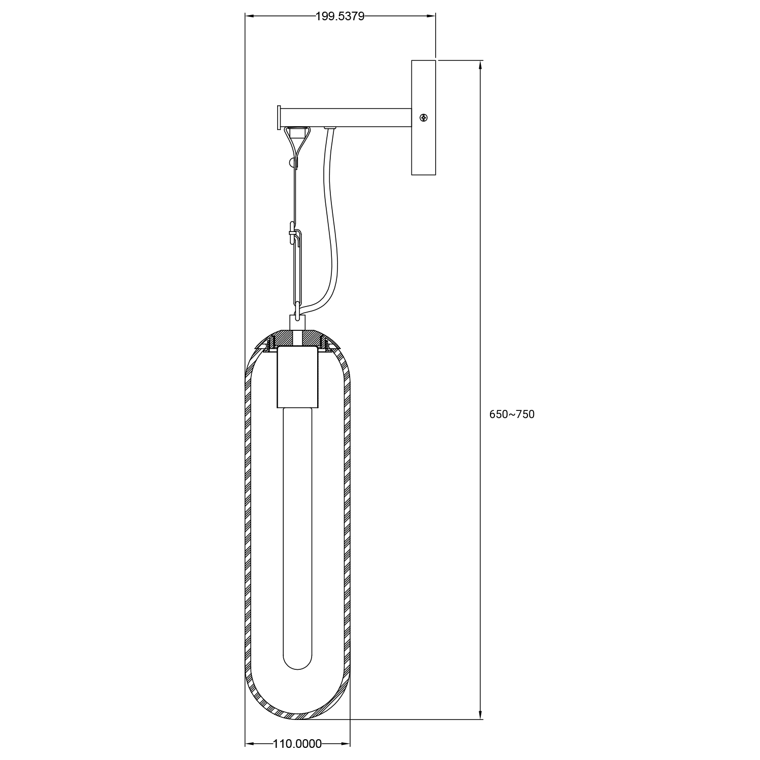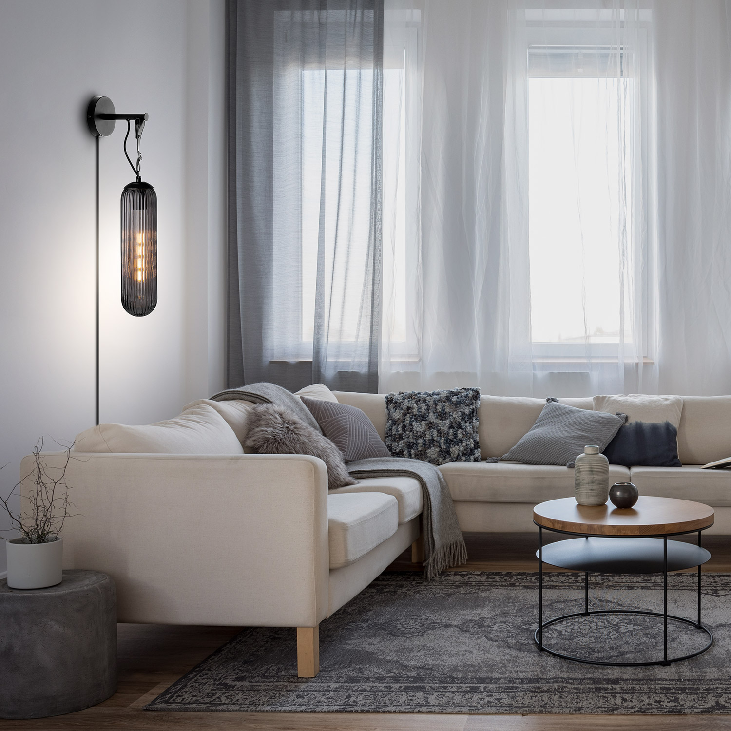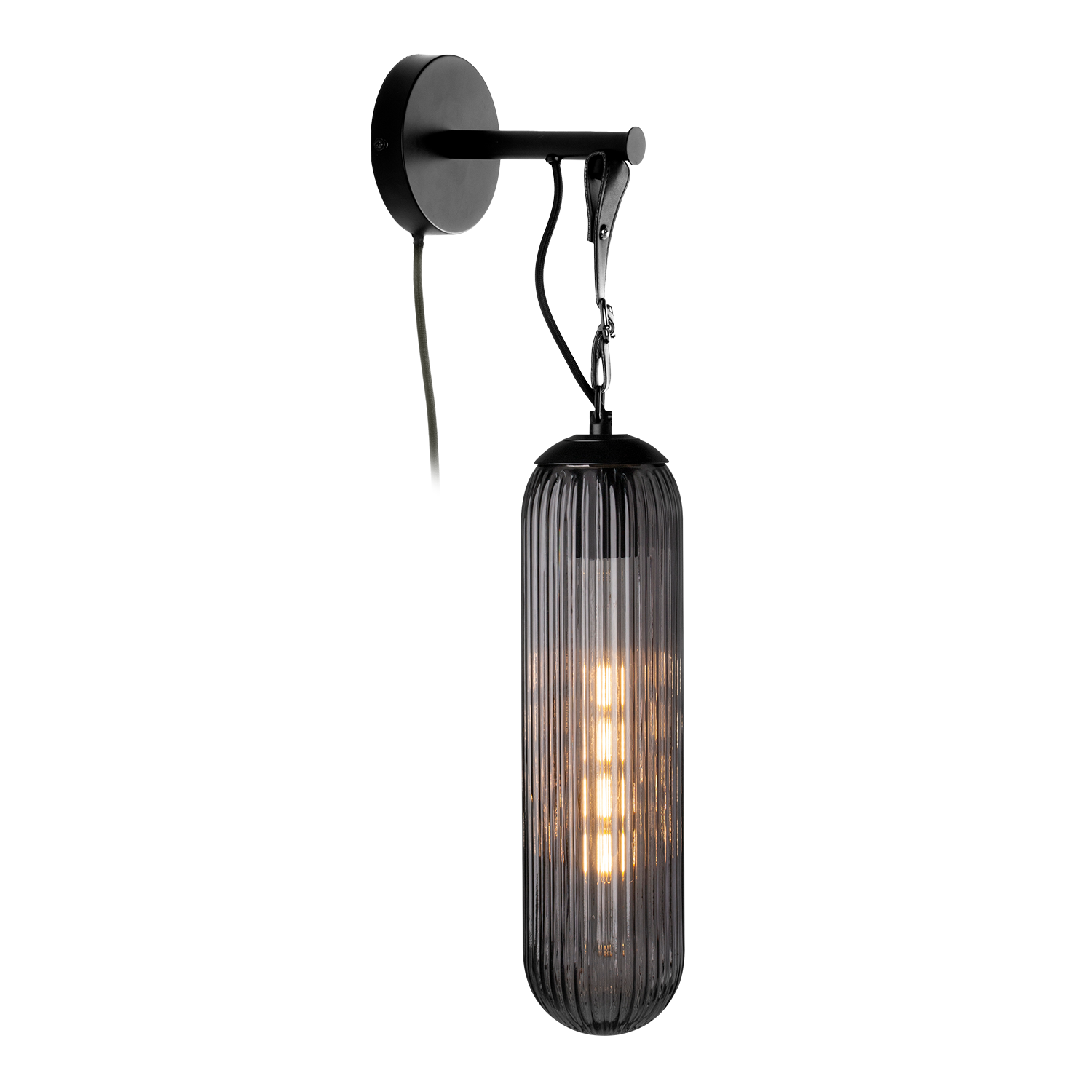 Tubus vegglampe med røykfarget glass, sort baldakin og skinnreim.